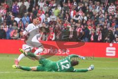 Fotograf: Stefan Bösl - kbumm.agentur Event: 3. Liga - Energie Cottbus - FC Ingolstadt 04 - 1:4 Bildbeschreibung: 3. Liga; Energie Cottbus - FC Ingolstadt 04; Torchance verpasst Benjamin Kanuric (8, FCI) Torwart Bethke Elias (12 EC)